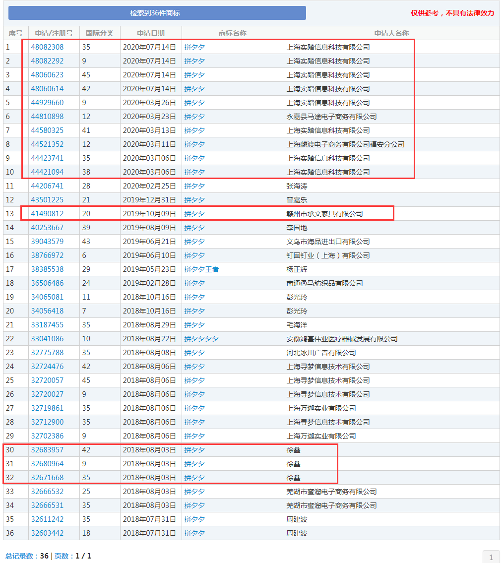 8月17日下午消息,天眼查显示,近日,拼多多关联公司上海寻梦信息技术有限公司申请注册“拼夕夕”商标,国际分类为“33-酒”,商标状态显示为“ 商标其他情形”,商标流程为“商标注册申请---申请收文”。 资料显示,上海寻梦信息技术有限公司成立于2014年1月,注册资本1000万人民币,由杭州埃米网络科技有限公司全资持股。公司经营范围包括网络科技、计算机软硬件领域内的技术开发、技术转让、技术咨询、技术服务,网络工程、计算机系统集成等。 而拼多多是隶属于上海寻梦信息技术有限公司的一家商家入驻模式的第三方移动电商平台。2015年4月,上海寻梦信息技术有限公司创立拼好货,同年9月,内部孵化电商平台“拼多多”,继而拼好货和拼多多合并。 值得注意的是,早在2018年8月,上海寻梦信息技术有限公司就曾申请注册过多个“拼夕夕”的商标,国际分类包括“科学仪器”、“网站服务”、“社会服务”等,目前商标状态多数显示为“等待实质审查”。 除上海寻梦信息技术有限公司外,上海实踏信息科技有限公司、永嘉县马途电子商务有限公司、赣州市承文家具有限公司、多个自然人等也申请过多个“拼夕夕”的相关商标,多数商标状态显示为“等待实质审查”。 对此,广大网友纷纷表示: – 并夕夕也一并申请了。 – 拼多多青春版。 – 并多多 – 拼歹歹别忘了。 – 拼少少也捎着吧