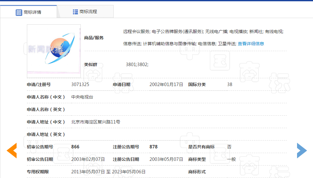 但是,最终只有38和41类的声音商标予以注册。可以看到,这是和《新闻联播》这一节目最密切相关的类别。