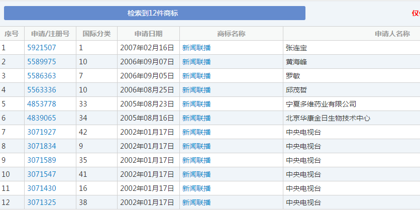 另外,通过上面的查询结果还可以看到,不像别的“傍名牌”,新闻联播被傍的次数还是比较少的,只有6个,且该6个都是文字商标。可想而知,这6个商标无一注册成功。